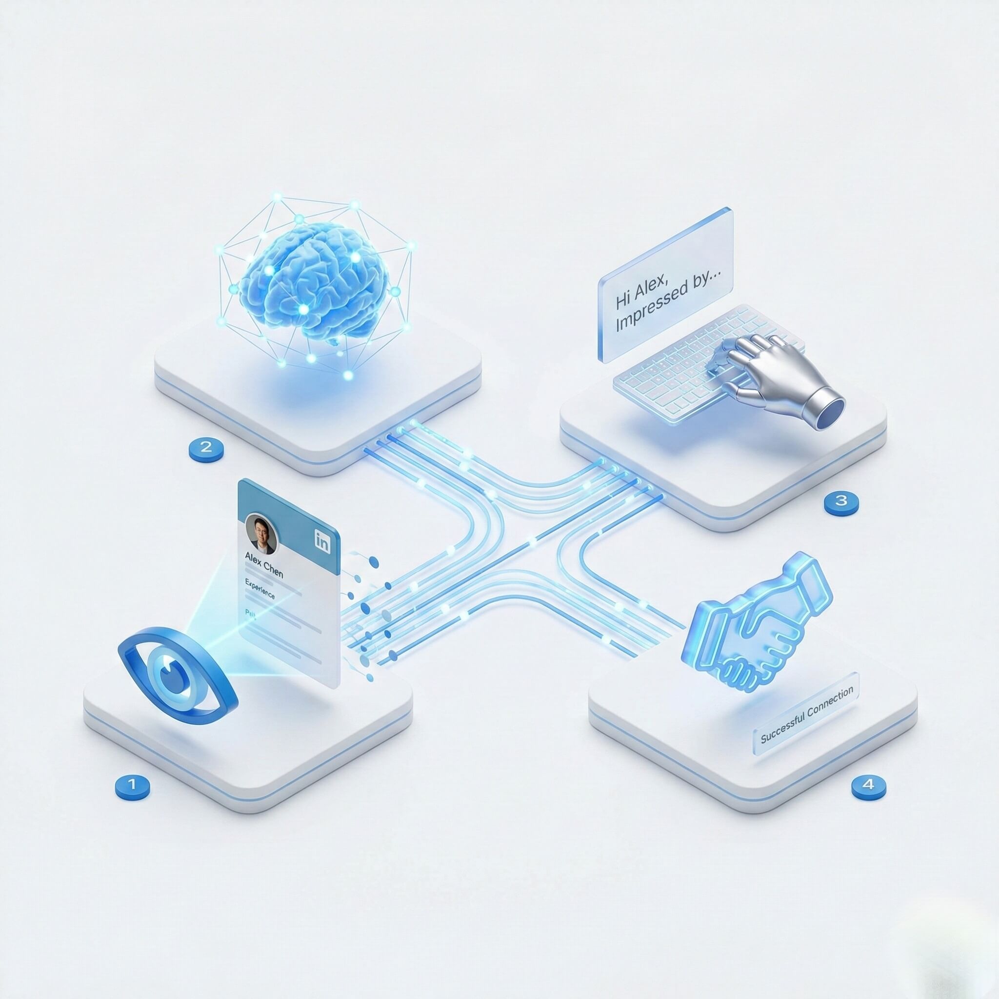 This is not a "LinkedIn Bot" that blasts links. It is a cognitive AI Employee that reads a prospect's recent posts, analyzes their company's quarterly report, and drafts a message so personalized it looks like you spent 30 minutes writing it.
